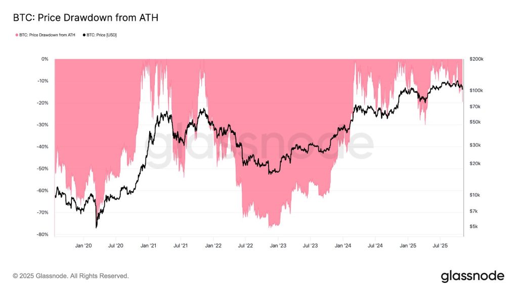 Some traders have called for calm, suggesting the correction is within historical norms. Data from Glassnode shows Bitcoin’s drawdown from October’s all-time high is about 21%, consistent with prior cycles.