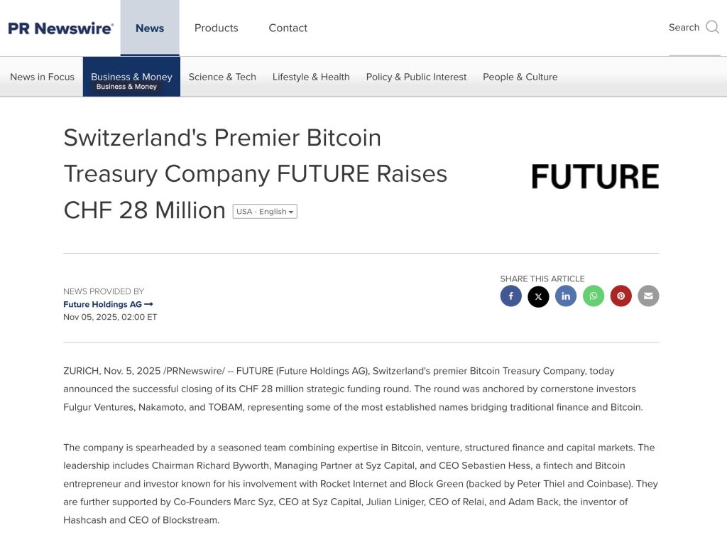 Future Holdings AG, a Zurich-based bitcoin treasury firm led by Adam Back, has raised $35 million to expand its institutional-focused Bitcoin operations, a move that comes as the market faces renewed volatility and investor caution.
