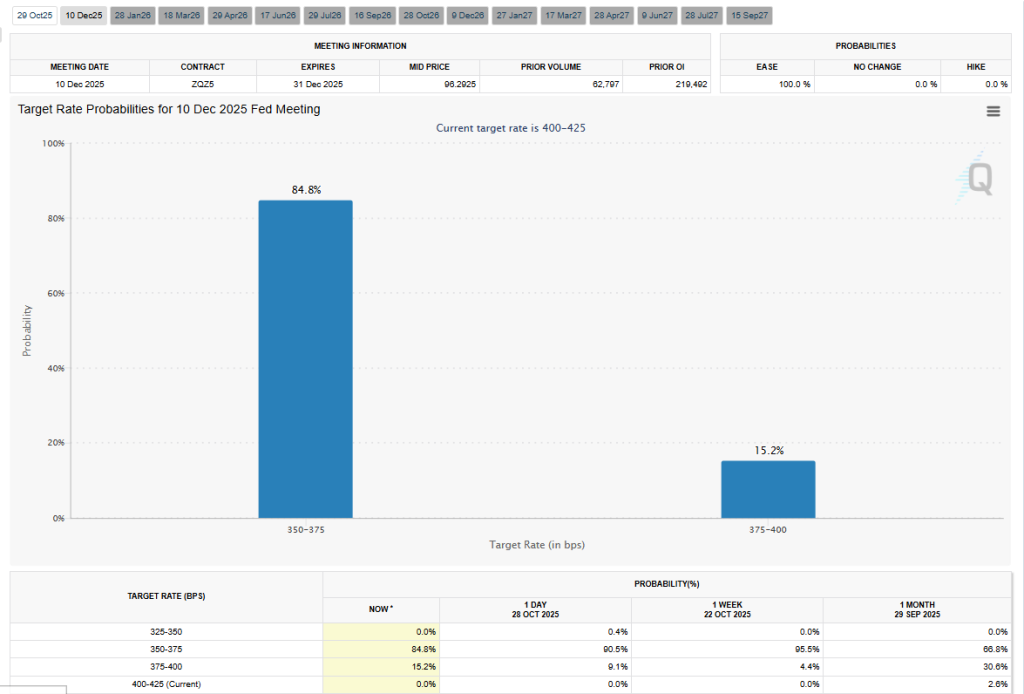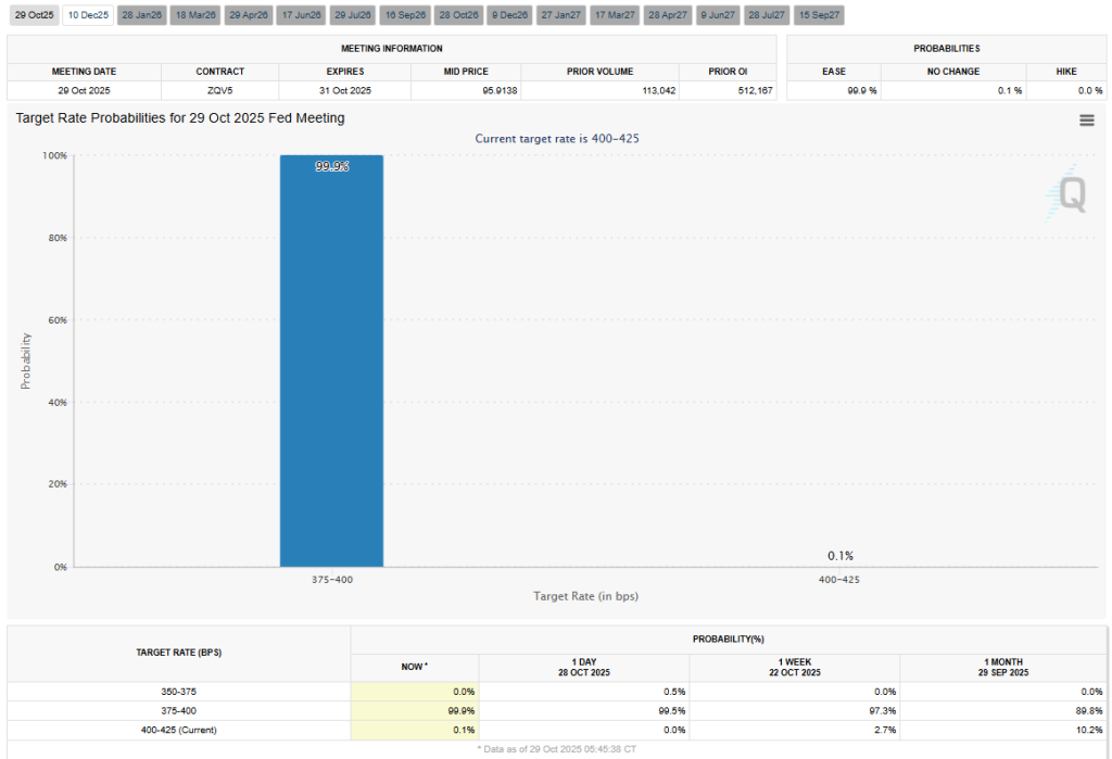 The Federal Reserve is widely expected to lower interest rates by 25 basis points to 4.00% during Wednesday’s policy meeting, marking a pivotal shift in the U.S. monetary cycle. According to the CME FedWatch Tool, traders are pricing in a 99.9% probability of a rate cut in October, with an additional easing expected by December.
