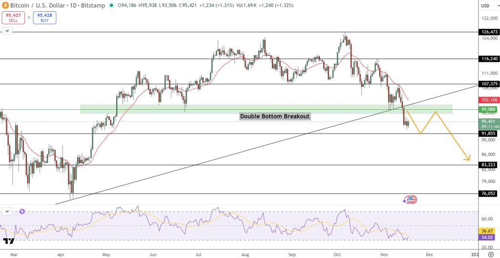 Bitcoin price prediction is bearish as BTC is trading below the $102,000–$107,000 supply zone, previously the neckline of a double-bottom breakout, has shifted momentum decisively toward sellers.