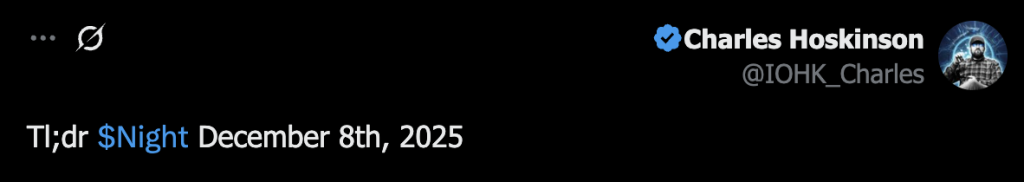 He also announced that the NIGHT token, the native utility token of Cardano’s privacy-focused sidechain Midnight, will begin distribution, exchange listings, and trading with liquidity on December 8, 2025.
