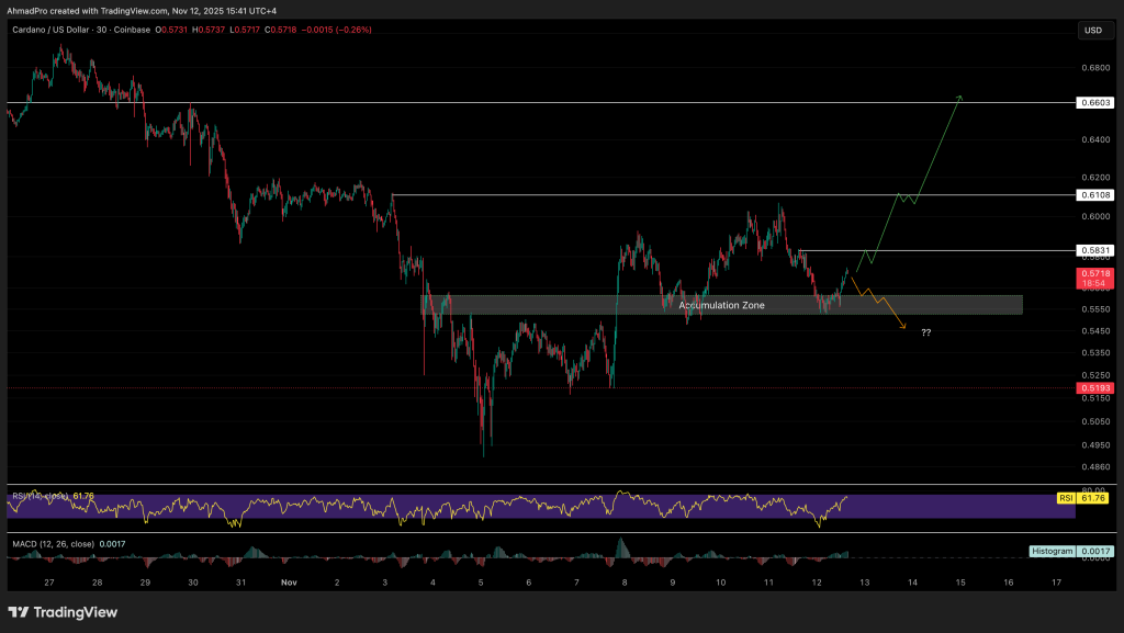 ADA is rebounding after hitting a buy wall marked as an accumulation zone on the chart. The RSI is sitting around 63, showing solid strength. ADA now needs some help from the broader market to keep the momentum going.