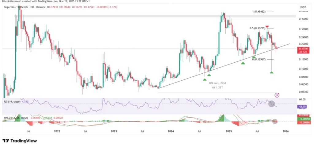 But the timing has been ruthless. Dogecoin’s price has fallen over 21% in the past month, slipping below $0.17 as it tests a long-term support level that has held since late 2023.