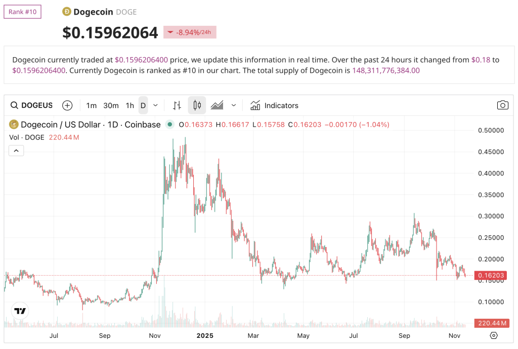 DOGE is currently trading near $0.163, down almost 7% in the last 24 hours.