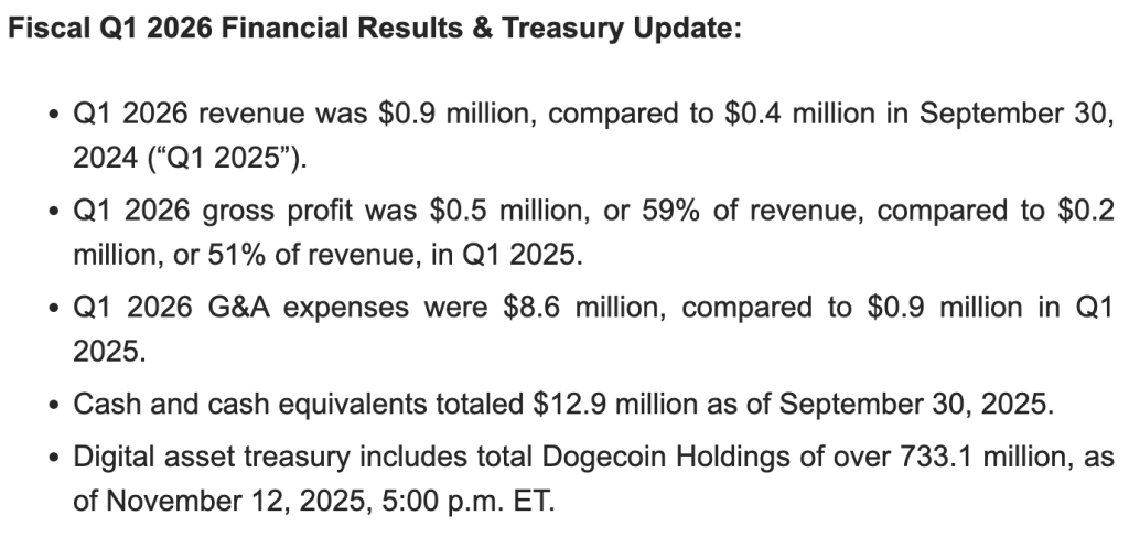 General and administrative expenses soared to $8.6 million from $0.9 million, driven by professional fees, stock-based compensation, new salaries, and insurance costs tied to its Dogecoin treasury rollout.