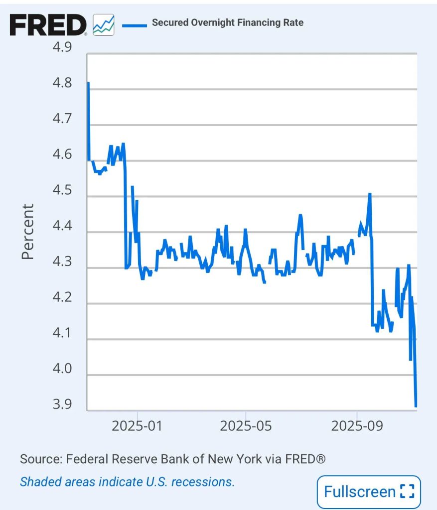 The Secured Overnight Financing Rate plummeted to 3.92% on November 6, its lowest level in two years, a collapse that financial analyst Shanaka Anslem warns “screams one word: panic.“