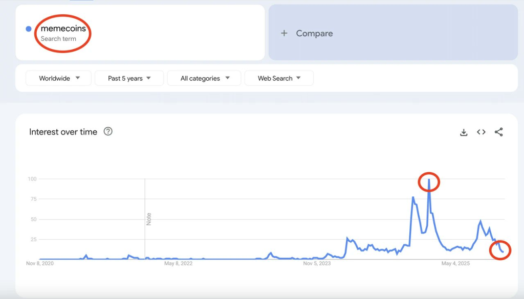 It really shows you where the market is at. Google searches for memecoins are at one of the lowest levels ever. There is zero interest from anyone outside the tiny bubble that memecoin holders sit in. The upside is that moments like this are usually when the market pulls something nobody expects.