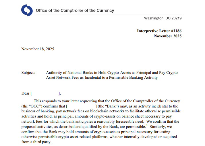 The new guidance confirms that national banks can now hold crypto as a principal when needed to pay network fees, commonly known as gas fees, on blockchains used to support “otherwise permissible” banking activities.