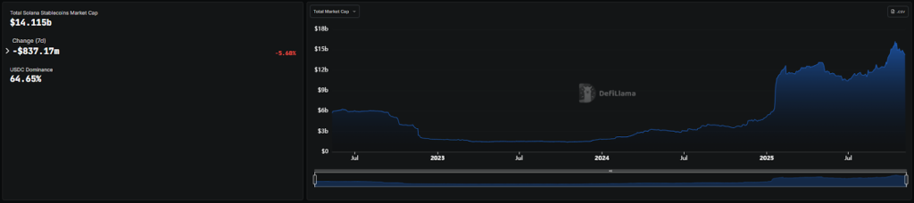The partnership positions USD1 to compete directly with Circle’s USDC, which currently dominates Solana’s stablecoin market. According to data from DeFiLlama, USDC accounts for more than $9 billion of the network’s $14.12 billion stablecoin supply.