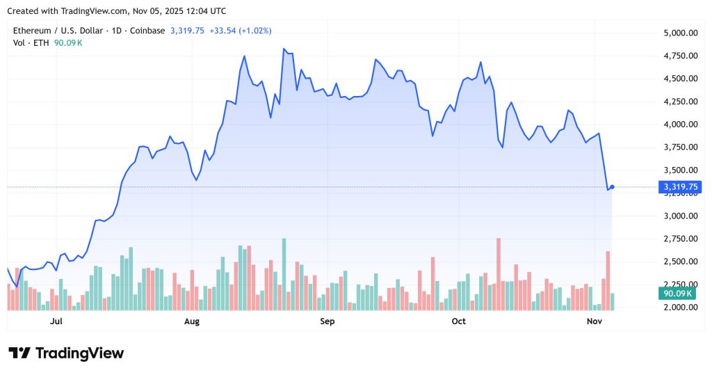 Meanwhile, Ethereum trades near $3,319, up 1.02% on the day, recovering slightly after Monday’s steep decline that sent prices to their lowest level since July.