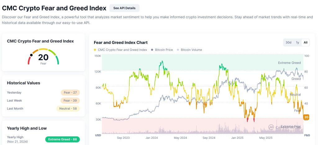 Meanwhile, market sentiment has deteriorated further, with the Crypto Fear and Greed Index plunging to 20, signaling deep “Fear.”