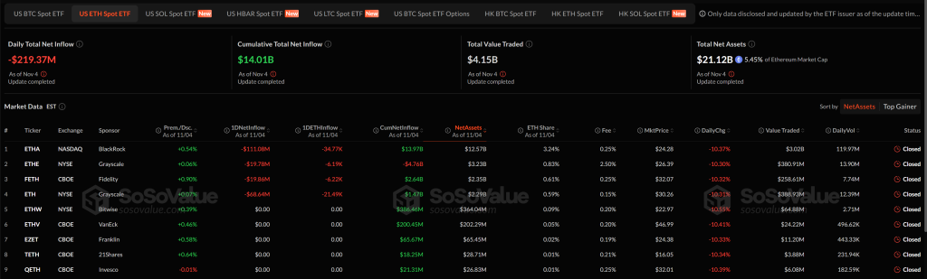 The total cumulative net inflow for US spot Ethereum ETFs now stands at $14.01 billion, while total net assets fell to $21.12 billion, representing 5.45% of Ethereum’s market capitalization. Daily trading volume reached $4.15 billion, underscoring elevated turnover even as institutional sentiment cooled.