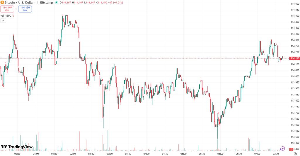 At the time of writing on Tuesday morning, BTC trades at $114,289. For the first part of the day, the coin traded sideways until it reached the intraday high of $115,755, before it plunged to the day’s low of $113,599 near the time of writing.
