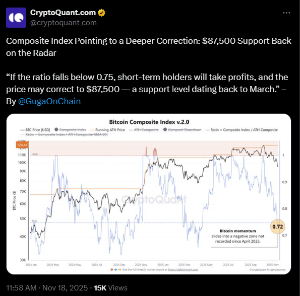 Meanwhile, according to on-chain data shared by analyst GugaOnChain, the market’s Composite Index fell to its lowest level since April 2025, a move which historically precedes sharper pullbacks. It indicates that BTC could revisit the $87,000 zone.